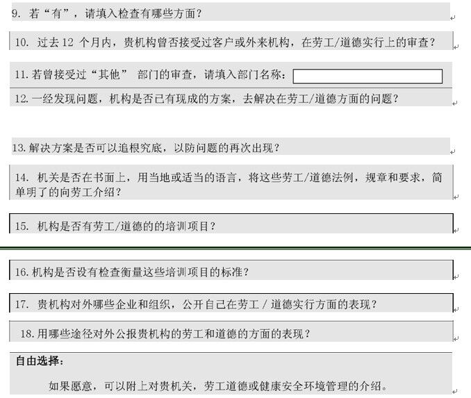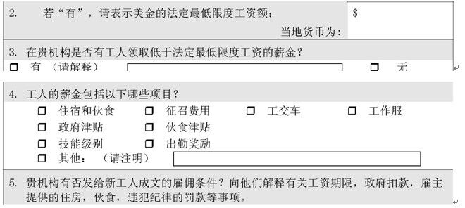 3. 貴機(jī)構(gòu)的勞工和道德制度文件,是否已用不同的語言,向當(dāng)?shù)貏诠ば麄髑宄?勞工□ 自由挑選職業(yè)□ 有□ 無□ 不征用童工□ 有□ 無□ 不歧視□ 有□ 無□ 人道的待遇□ 有□ 無□ 法定最低限度工資□ 有□ 無□ 工時□ 有□ 無□ 自由組織社團(tuán)□ 有□ 無